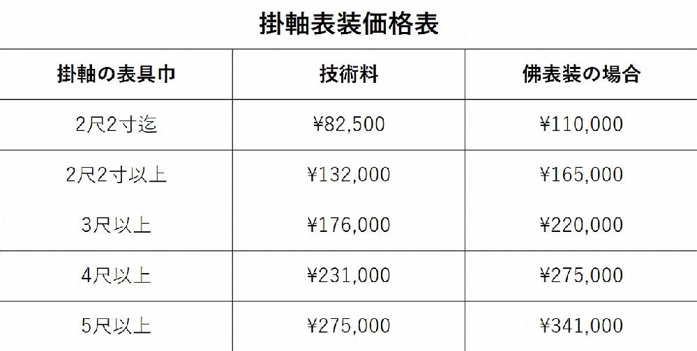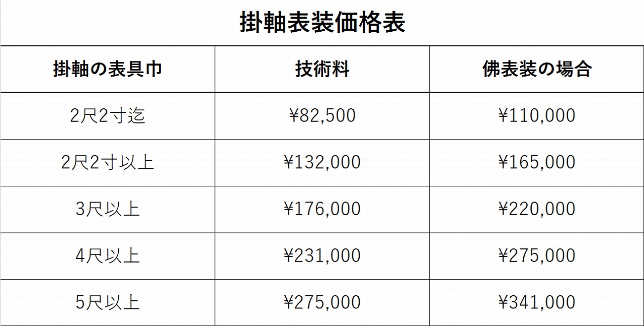 表具巾が2尺2寸(約67p)を超えたり、佛表装になると作業手順が増えて価格にも影響します。