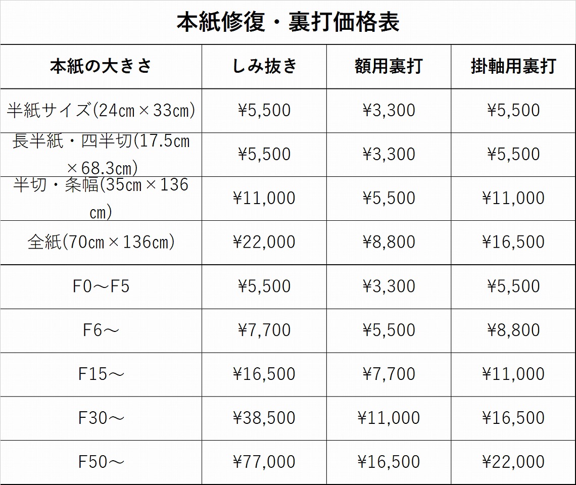※こちらに挙げさせていただいた例は新調した場合の価格です。時代の経った作品や曼荼羅や涅槃図などの大作に関してはリスク管理費用なども加味いたしますので、細かな打合せの上、見積らせていただきます。